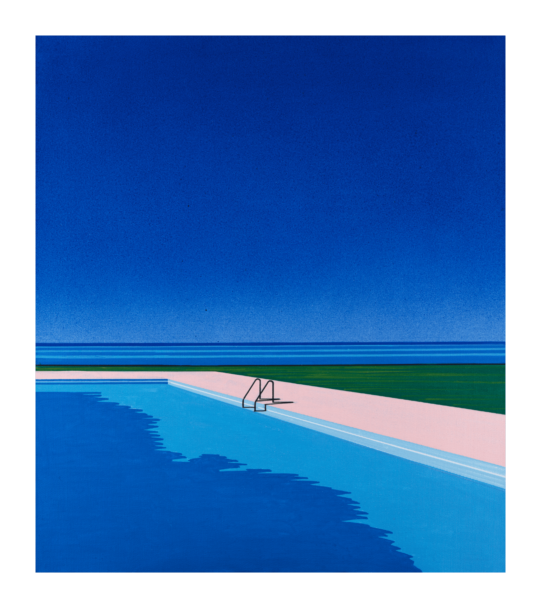 L’eau et le ciel se fondent harmonieusement, là où une piscine devient océan, et l’océan, pensée. Pas de gens, pas de bruit, seulement une échelle qui capte le soleil, un passage vers l’inconnu, clair et calme. Les espaces de Nagai sont immobiles, mais le sentiment est profond.