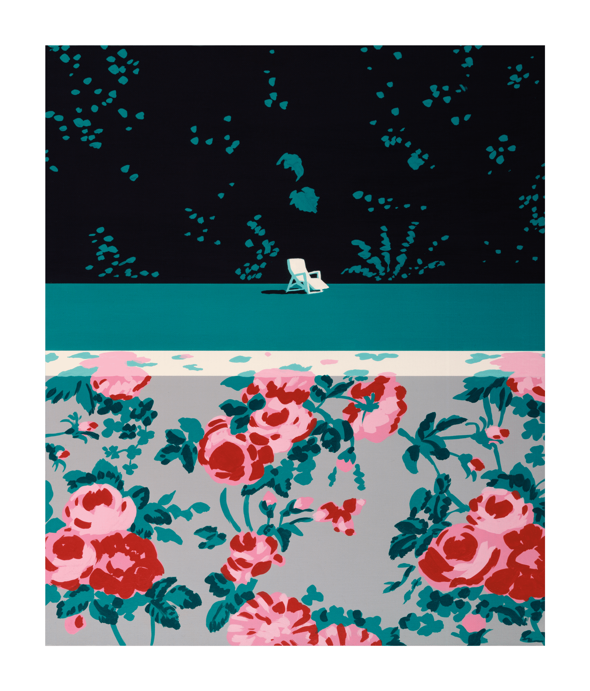 Une chaise solitaire fait face au vide, seule sous un ciel de feuilles sombres et de silence. En contrebas, un champ de fleurs peintes s’élève comme un souvenir, mi-rêve, mi-papier peint d’une pièce oubliée. La palette de Nagai lie la solitude à la douceur, avec un calme qui parle plus fort que les mots.